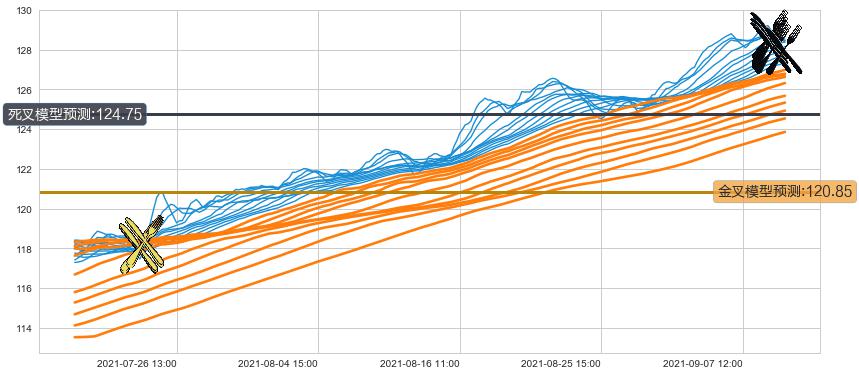 ➢ 30小时均线于(09-08 15:00: 128.41)形成【死叉】基于【死叉历史模型】预测死叉后最低波谷价格: 125.22, 死叉后最低价格127.43,尚未达到预测最低波谷价格, 预期继续下跌