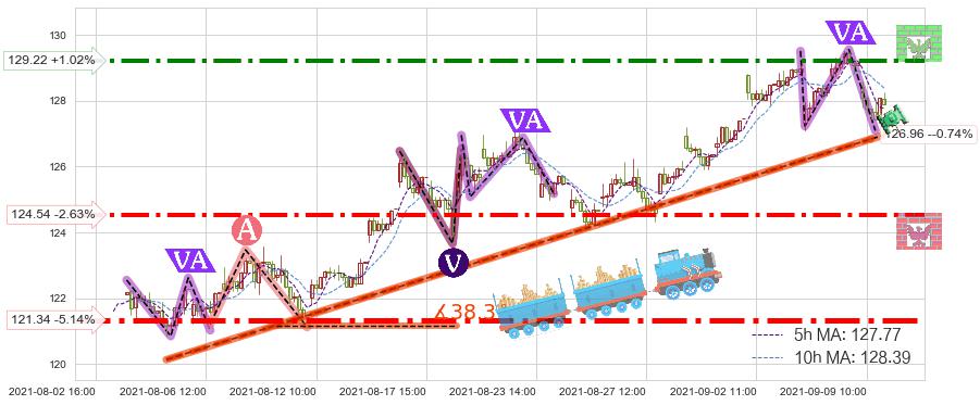 ♘ 阻力价格位129.22,可信任强度73.03%,距离最后交易2021-09-09 14:00形成的收盘价格127.91相差 +1.02%