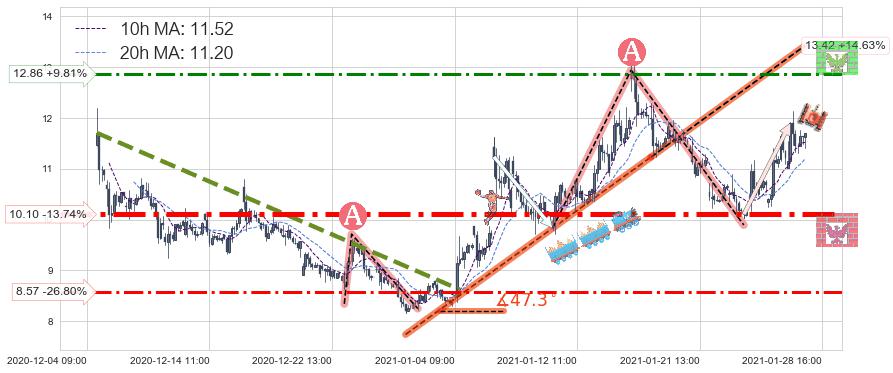 ♘ 支撑价格位10.10,可信任强度92.63%,距离最后交易2021-01-28 16:00形成的收盘价格11.71相差 -13.74%