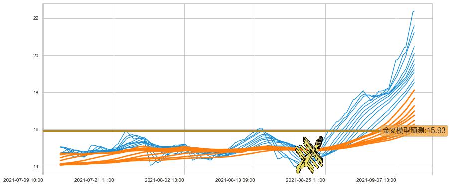 ➣ 70小时均线于(08-23 14:00: 14.95)形成【金叉】基于【金叉历史模型】预测金叉后最高波峰价格: 16.06, 金叉后最高价格22.45,已经上涨超出预测最高波峰价格, 预期回调