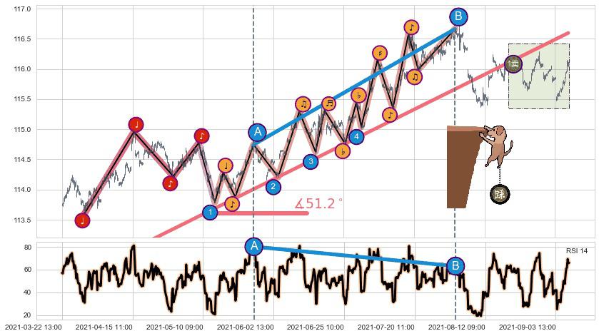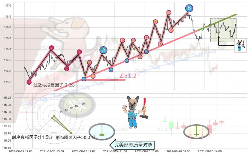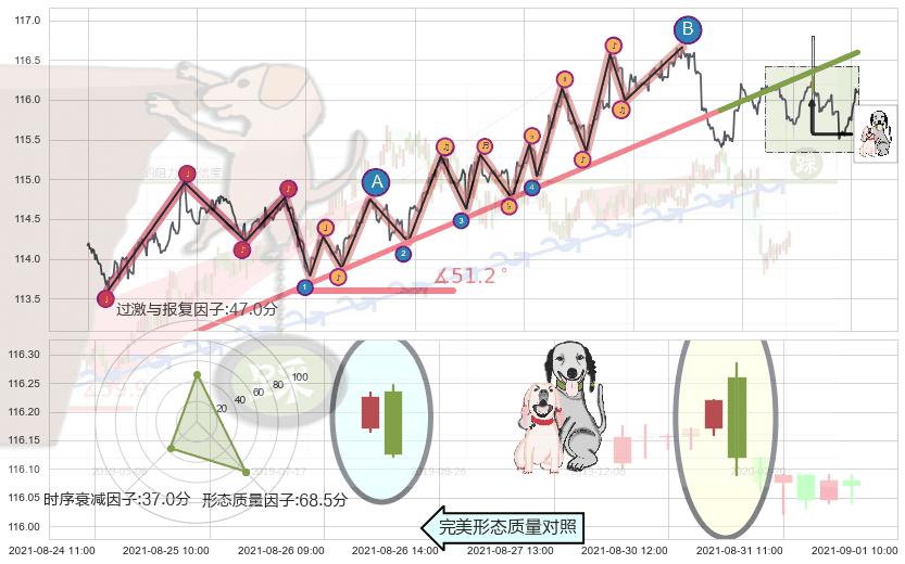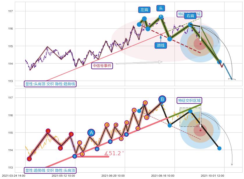 ➣ 2021-03-30 09:00-2021-08-10 14:00上升趋势存在反转[风险],其原上升趋势的支撑位(116.60)已破位[强阻力信号],原上升趋势角度: 51.2˚