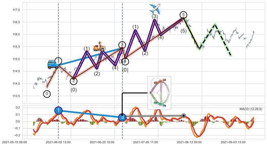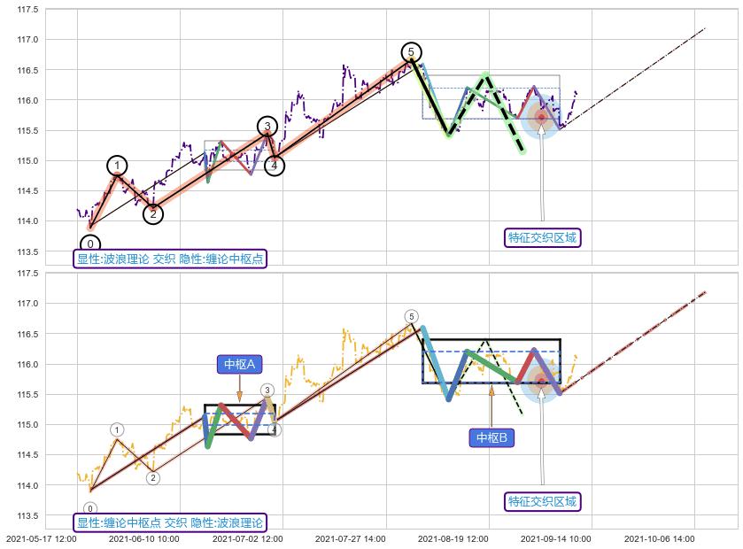 ➢ 波浪理论与缠论中枢点信号事件周期长度级别相同,同周期信号事件