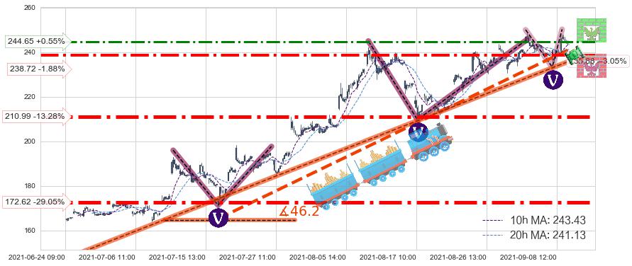 ♘ 在最后的上升阶段2021-06-24 10:00至2021-09-09 15:00存在 持续未破位的支撑位 ,支撑价格235.88,支撑可信任强度88.73%,其距离最后价格243.31相差 -3.05%