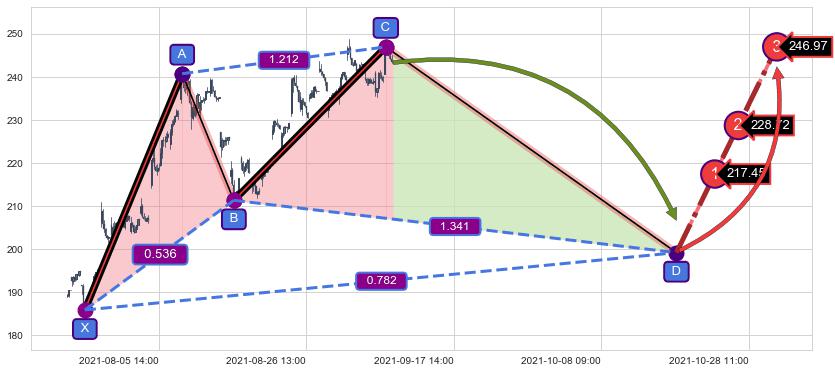 ➢ 距离预测D点位置有足够的下跌空间, 与看涨【赛福】形态相反,实际方向【看跌】