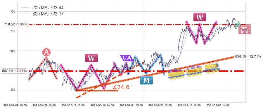 从2021-05-13 11:00至2021-09-09 14:00,共包含549个小时,阶段股价上涨29.86%,阶段股价变动位移路程比: 1 : 8,上涨趋势角度: 24.6