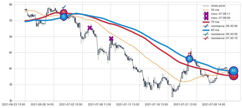 ➣ 85小时均线于(08-13 14:00: 34.37)形成【金叉】基于【金叉历史模型】预测金叉后最高波峰价格: 46.02, 金叉后最高价格48.55,已经上涨超出预测最高波峰价格, 预期回调