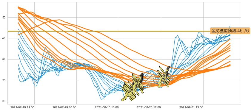 ➣ 100小时均线于(08-13 14:00: 34.94)形成【金叉】基于【金叉历史模型】预测金叉后最高波峰价格: 47.17, 金叉后最高价格48.55,已经上涨超出预测最高波峰价格, 预期回调
