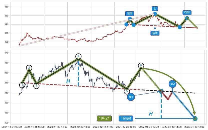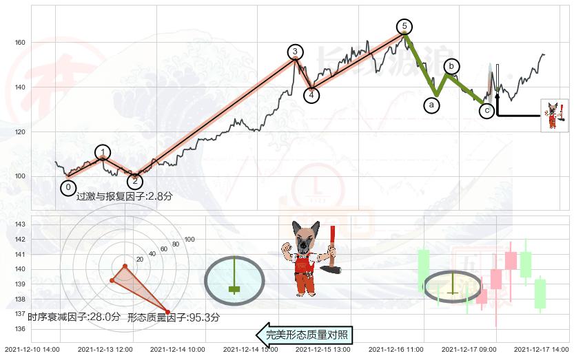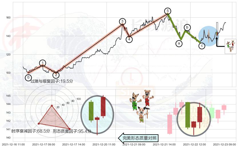 从2021-12-20 12:00至2021-12-27 15:00,共包含34个小时,阶段股价上涨14.56%,阶段股价变动位移路程比: 1 : 1.7
