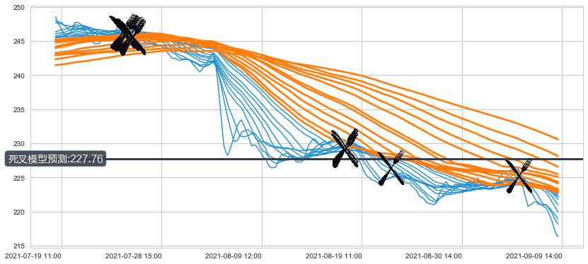 ➣ 70小时均线于(07-26 10:00: 245.92)形成【死叉】基于【死叉历史模型】预测死叉后最低波谷价格: 239.52, 死叉后最低价格215.58,已经下跌超出预测最低波谷价格, 预期反弹