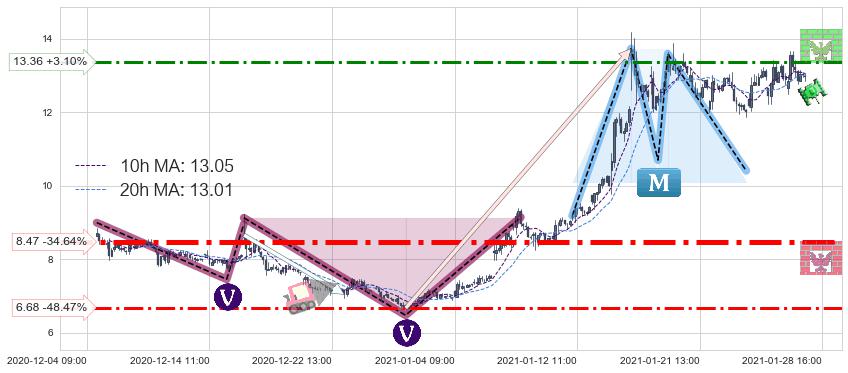 ♘ 阻力价格位13.36,可信任强度66.43%,距离最后交易2021-01-28 16:00形成的收盘价格12.96相差 +3.10%