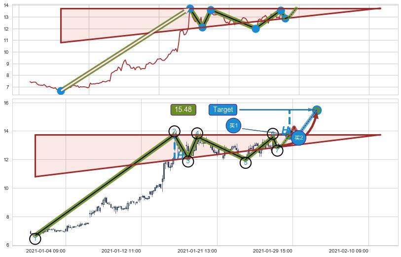 从2020-12-23 13:00至2021-01-28 16:00,共包含186个小时,阶段股价上涨60.34%,阶段股价变动位移路程比: 1 : 4