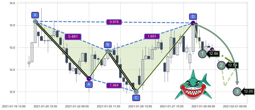 ➢ 谐波鲨鱼:已到达d点:猜想c拉升到达d点后泄力性下沉下跌(均值回复)