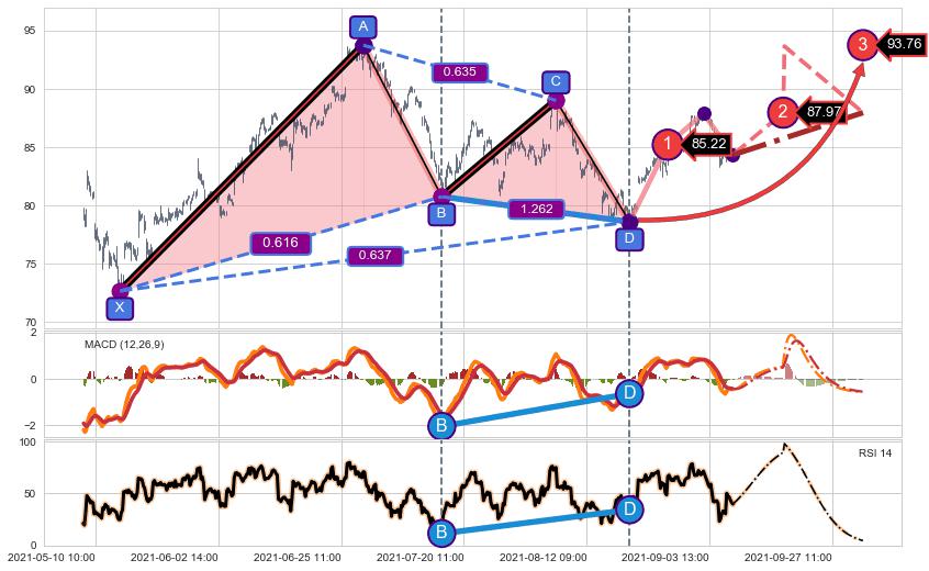 ➢ 谐波价格D点比B点低 ⤵,【MACD】指标D点比B点高 ⤴️