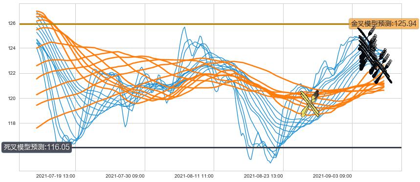 ➢ 21小时均线于(09-07 13:00: 124.72)形成【死叉】基于【死叉历史模型】预测死叉后最低波谷价格: 120.86, 死叉后最低价格120.75,虽然已经到达预测最低波谷价格,但耗时间很短动能很强, 预期继续下跌