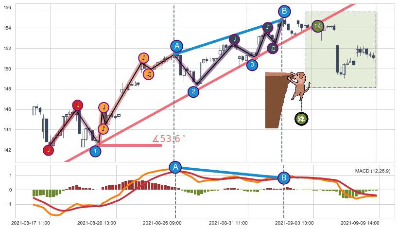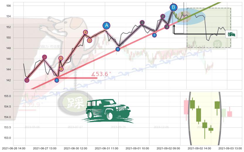 从2021-08-26 14:00至2021-09-02 13:00,共包含30个小时,阶段股价上涨3.37%,阶段股价变动位移路程比: 1 : 2,上涨趋势角度: 48.8