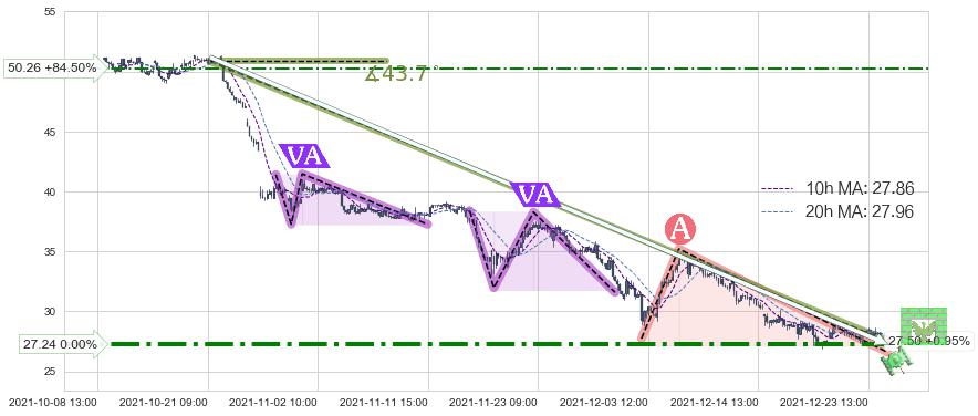 🦴 长线均值回复组合短线趋势跟踪[强阻力信号]2021-10-21 10:00-2021-12-27 15:00下跌趋势依然成立(下跌趋势跟踪依然存在),短线价格略微上行反弹(均值回复猜想),即将接近下跌趋势提供的未破位阻力价格:27.50。