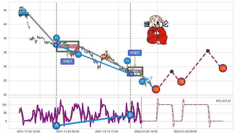 ➢ 缠论中枢点:猜想破位中枢B后持续下拉 → 下跌 → 破位中枢B支撑 → 持续趋势跟踪