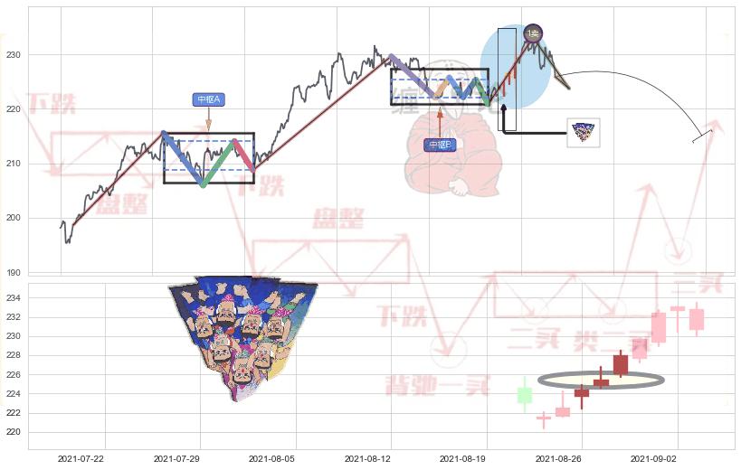 ➣ 【中枢B】:08-02:13-08-24:11,中枢由6笔构成,共106交易小时, ZG=225.32, ZD=222.10