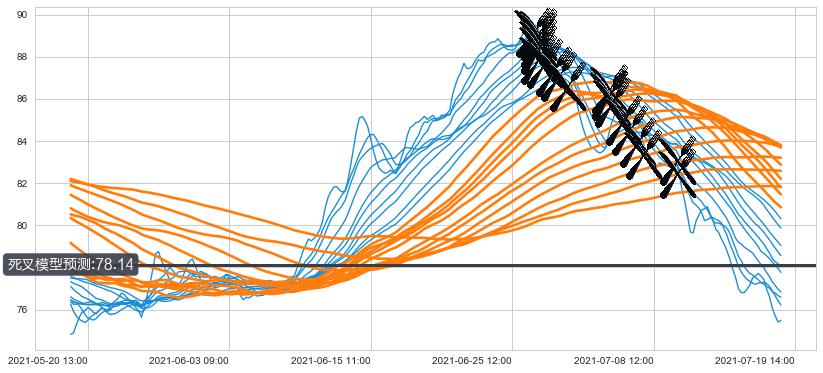 ➢ 160小时均线于(07-07 15:00: 83.28)形成【死叉】基于【死叉历史模型】预测死叉后最低波谷价格: 75.19, 死叉后最低价格74.78,虽然已经到达预测最低波谷价格,但耗时间很短动能很强, 预期继续下跌