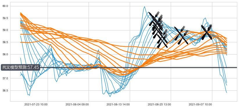 ➣ 70小时均线于(08-27 09:00: 58.85)形成【死叉】基于【死叉历史模型】预测死叉后最低波谷价格: 57.45, 死叉后最低价格56.26,已经下跌超出预测最低波谷价格, 预期反弹