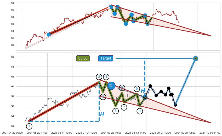 ➣ D点拟合预测价格54.55,距离最后交易收盘价格56.29相差 -3.09%