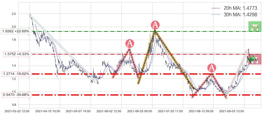 ♘ 阻力价格位1.9262,可信任强度53.90%,距离最后交易2021-09-09 14:00形成的收盘价格1.5700相差 +22.69%