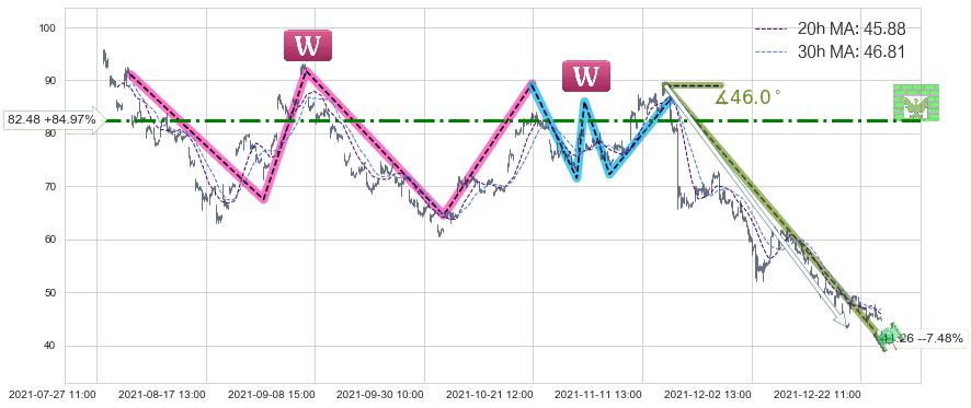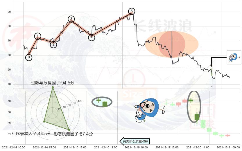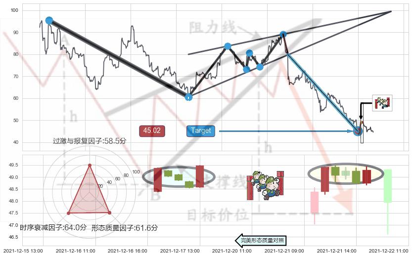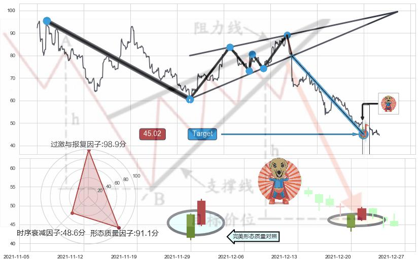 从2021-11-16 12:00至2021-12-27 14:00,共包含198个小时,阶段股价下跌-63.23%,阶段股价变动位移路程比: 1 : 3,下跌趋势角度: 46.0