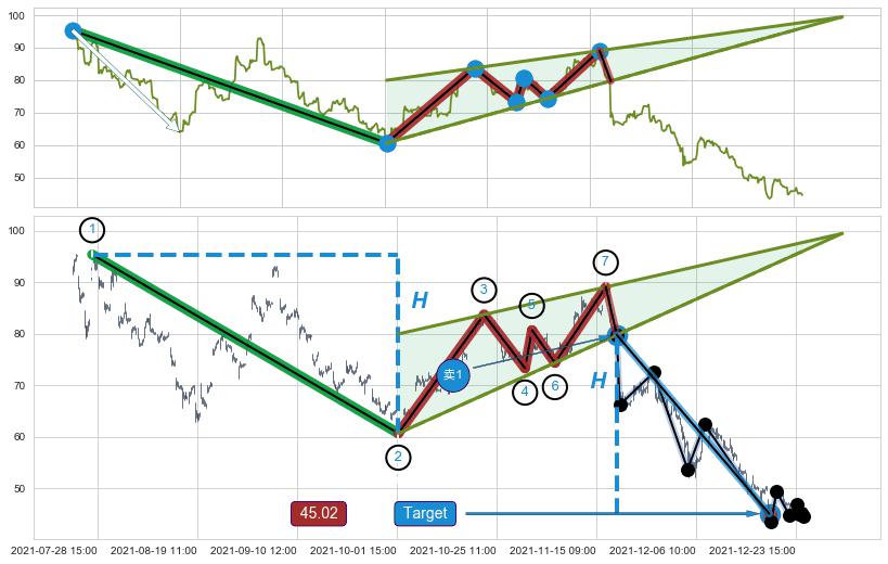 ➣ 升楔型:下跌目标target已达成:猜想强支撑位临近,预期反弹上涨(均值回复)