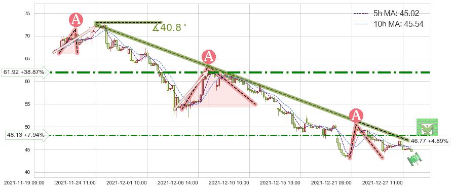 ➢ 预测:2021-12-28 13:00,【小幅反弹】稳定目前下跌趋势的前提下,预测价格:45.94