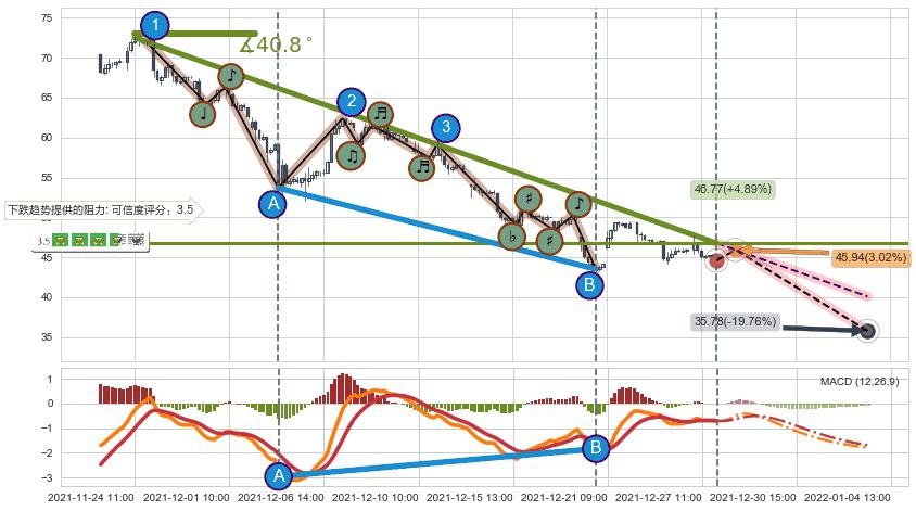 ♘ 在最后的下跌阶段2021-11-24 11:00至2021-12-21 10:00,存在 持续未破位的阻力位 ,阻力价格46.77,可信任强度80.22%,其距离最后价格44.59相差 +4.89%