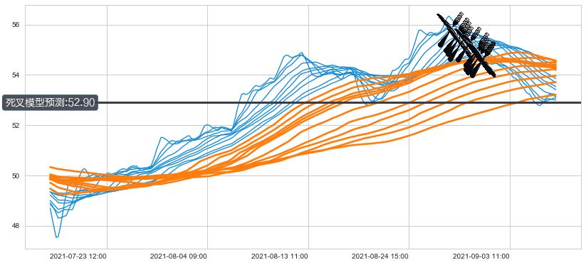 ➢ 60小时均线于(08-31 15:00: 54.77)形成【死叉】基于【死叉历史模型】预测死叉后最低波谷价格: 53.07, 死叉后最低价格52.65,已经下跌超出预测最低波谷价格, 预期反弹