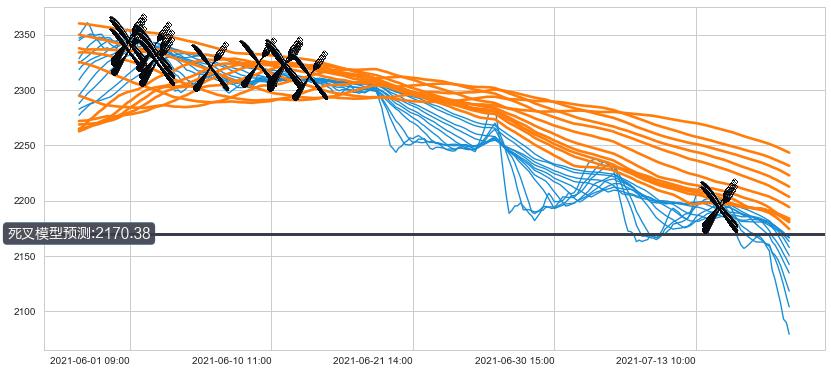 ➣ 120小时均线于(06-14 10:00: 2312.39)形成【死叉】基于【死叉历史模型】预测死叉后最低波谷价格: 2156.87, 死叉后最低价格2067.55,已经下跌超出预测最低波谷价格, 预期反弹
