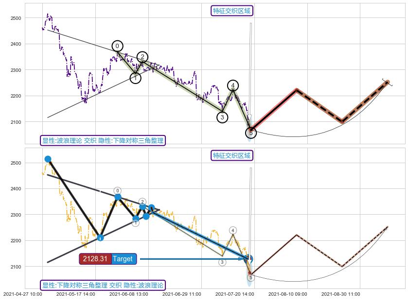 ➢ 波浪理论与下降对称三角整理信号事件周期长度级别相同,同周期信号事件