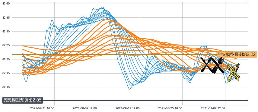 ➣ 60小时均线于(09-03 09:00: 82.18)形成【死叉】基于【死叉历史模型】预测死叉后最低波谷价格: 82.06, 死叉后最低价格82.11,尚未达到预测最低波谷价格, 预期继续下跌