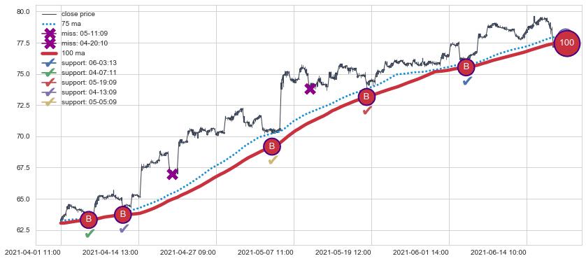➢ 最优均线组合共正确确认支撑阻力信号10处,正确确认率 71.43%