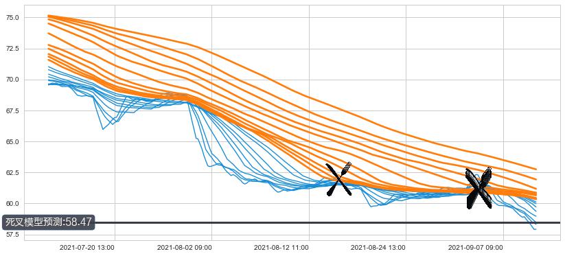 ➣ 75小时均线于(09-01 14:00: 60.95)形成【死叉】基于【死叉历史模型】预测死叉后最低波谷价格: 57.59, 死叉后最低价格57.79,尚未达到预测最低波谷价格, 预期继续下跌