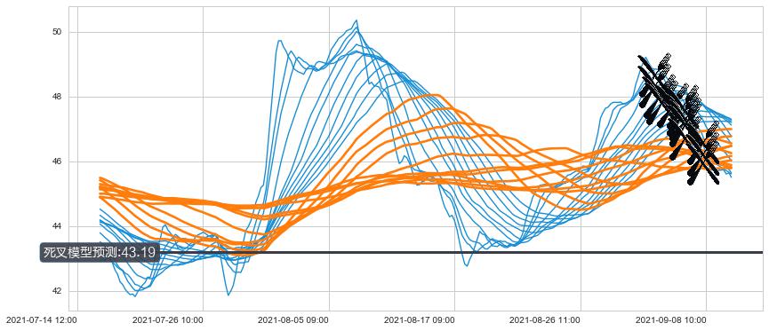 ➣ 34小时均线于(09-02 12:00: 47.77)形成【死叉】基于【死叉历史模型】预测死叉后最低波谷价格: 45.32, 死叉后最低价格45.09,虽然已经到达预测最低波谷价格,但耗时间很短动能很强, 预期继续下跌