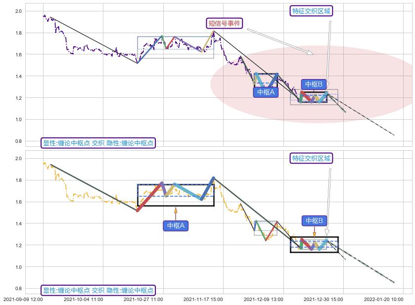 ➣ 缠论中枢点:猜想破位中枢B后持续下拉 → 下跌 → 破位中枢B支撑 → 持续趋势跟踪