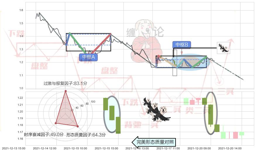 ➢ 下跌镊子线(n形磁铁) + 缠论中枢点破位中枢B支撑下拉信号叠加后【反向回撤率】偏高,【看空】信号叠加【存续影响降权】