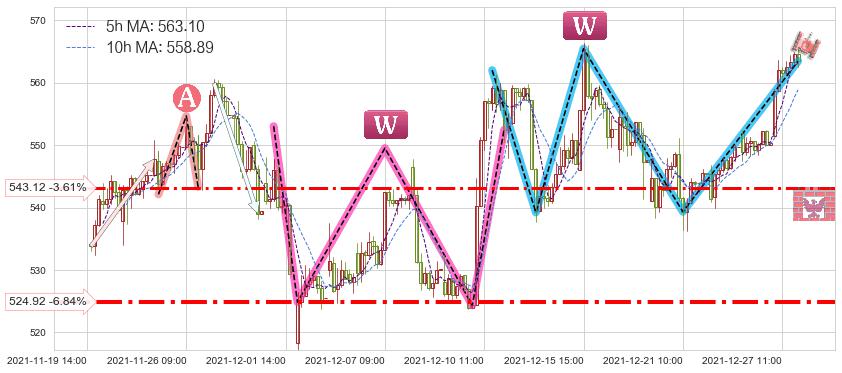 ♘ 支撑价格位543.12,可信任强度66.85%,距离最后交易2021-12-27 15:00形成的收盘价格563.47相差 -3.61%