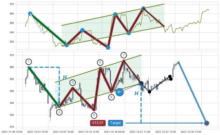 从2021-12-01 11:00至2021-12-10 13:00,共包含56个小时,阶段股价上涨2.57%,阶段股价变动位移路程比: 1 : 10