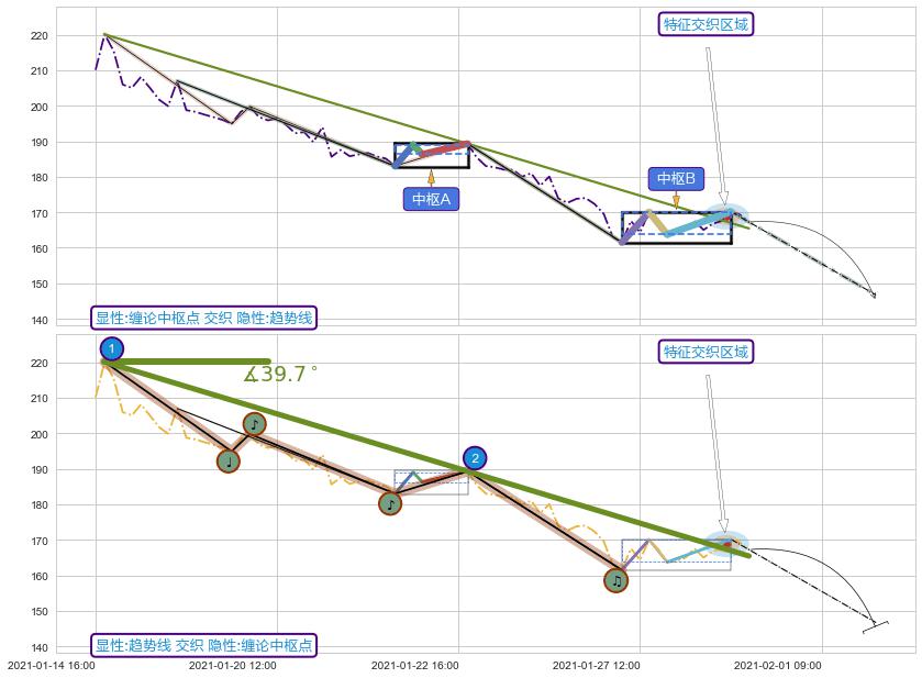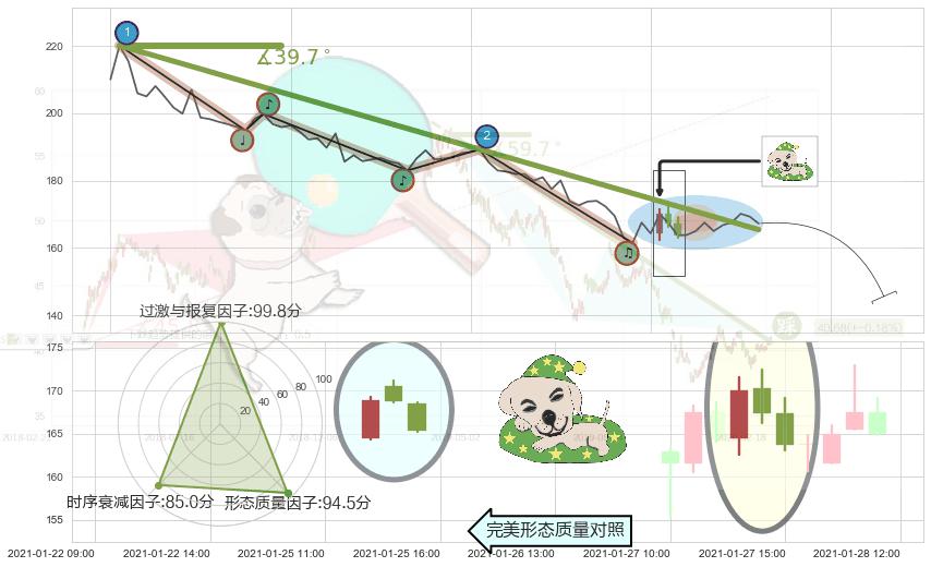 从2021-01-15 09:00至2021-01-28 16:00,共包含72个小时,阶段股价下跌-26.45%,阶段股价变动位移路程比: 1 : 3,下跌趋势角度: 39.7
