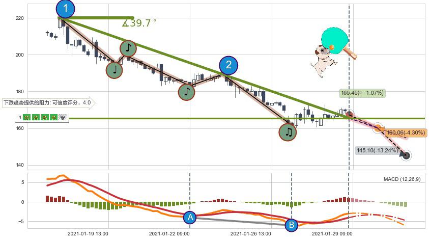 ➣ 预测:2021-02-01 15:00,【继续下探】稳定目前下跌趋势的前提下,预测价格:145.10
