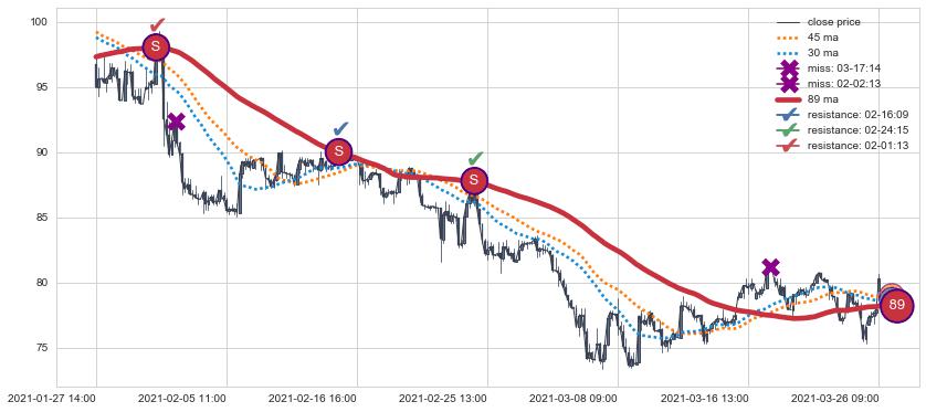 01-27 14:00至03-26 09:00 慢线与快线呈空头排列, 慢线与快线接触少,无缠绕