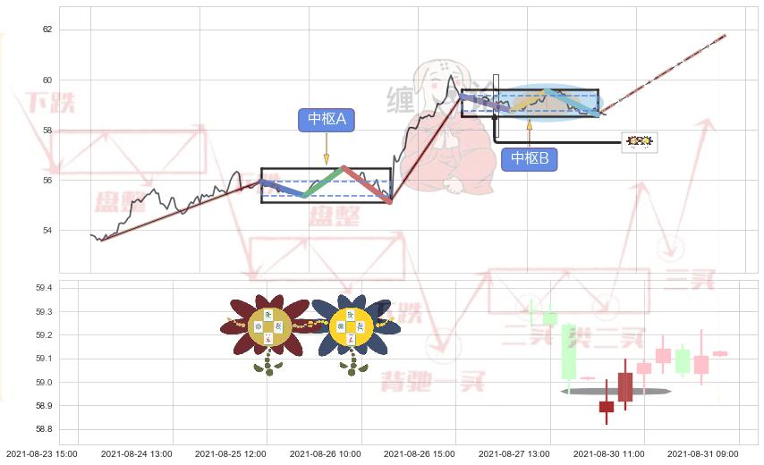 ➢ 【中枢A】:08-05:12-08-18:14,中枢由4笔构成,共60交易小时, ZG=55.95, ZD=55.37