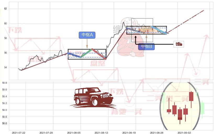➣ 【中枢B】:08-25:15-09-09:11,中枢由4笔构成,共63交易小时, ZG=59.35, ZD=58.76