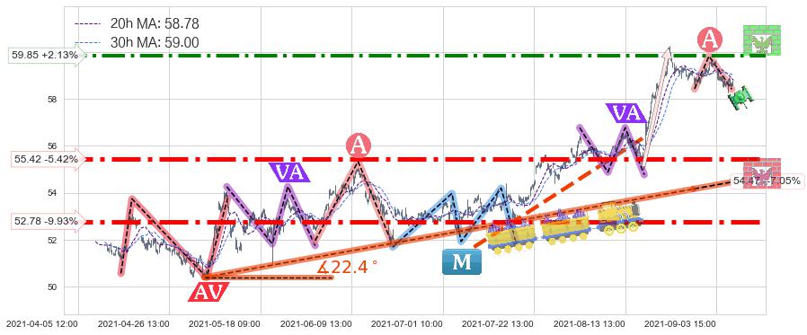 ♘ 阻力价格位59.85,可信任强度74.29%,距离最后交易2021-09-09 15:00形成的收盘价格58.60相差 +2.13%