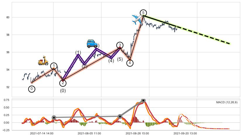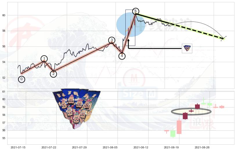 ➣ 顶部尽头线(下山虎) + 波浪理论上涨浪:浪5回调拐点信号叠加后【反向回撤率】低,【看空】信号叠加【存续影响大】