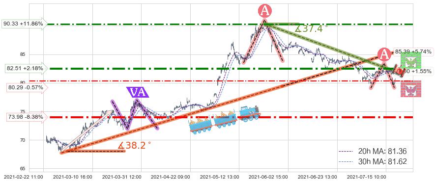 ♘ 阻力价格位82.51,可信任强度71.45%,距离最后交易2021-07-19 15:00形成的收盘价格80.75相差 +2.18%