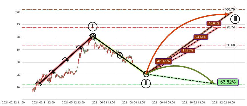 ➢ 循环浪继续向上【最低】位置(10-18:13, 86.69),匹配聚类样本比例25.33%, 可能性概率11.70%
